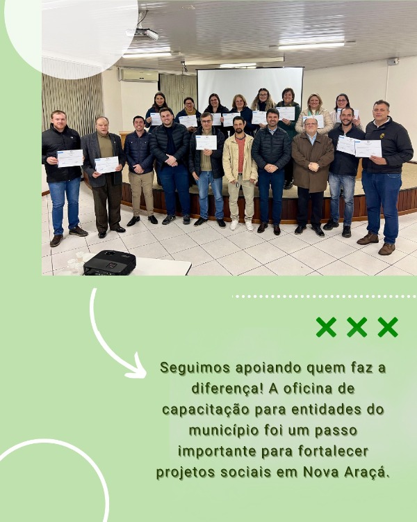 Nesta semana, entre terça e quinta-feira, aconteceu em Nova Araçá a Oficina de Captação de Recursos para Projetos Sociais, voltada às entidades do município. A atividade, que teve seu encerramento ontem, foi uma iniciativa do deputado estadual Neri, o Carteiro, em parceria com o presidente da Câmara de Vereadores, André Dall Agnol. A oficina abordou temas como conceitos, execução, legalidade e técnicas de redação, contribuindo para fortalecer o trabalho das entidades locais.