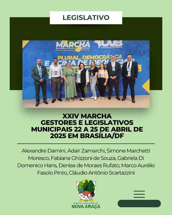 Os Vereadores estão participando da XXIV Marcha dos Gestores e Legislativos Municipais, que acontece de 22 a 25 de abril de 2025, em Brasília/DF. Representando nosso município, estão presentes: Alexandre Damini, Adair Zamarchi, Simone Marchetti Moresco, Fabiana Ghizzoni de Souza, Gabriela Di Domenico Hans, Denise de Moraes Rufato, Marco Aurélio Fasolo Pinto e Cláudio Antônio Scartazzini O evento é um importante espaço de diálogo, aprendizado e fortalecimento do poder legislativo municipal. Seguimos comprometidos com o desenvolvimento da nossa cidade!