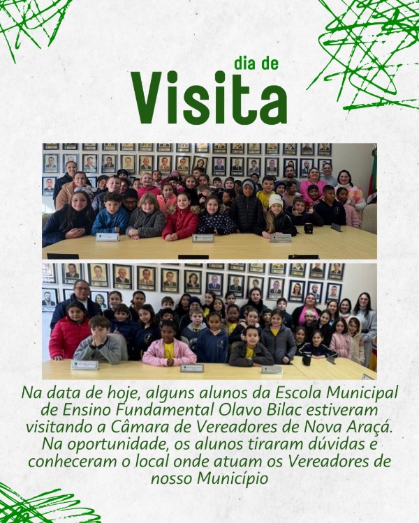 Hoje foi dia de aprendizado! Alunos da E.M.E.F. Olavo Bilac visitaram a Câmara de Vereadores de Nova Araçá, conheceram o trabalho dos legisladores e tiraram dúvidas sobre o funcionamento do nosso Município.