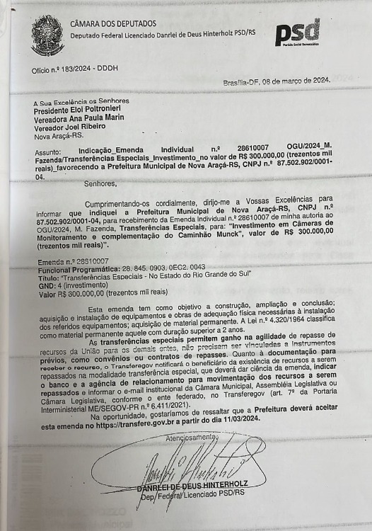 A Câmara de Vereadores de Nova Araçá agradece ao Deputado Danrlei de Deus pelo apoio e comprometimento demonstrados com nossa região e município.