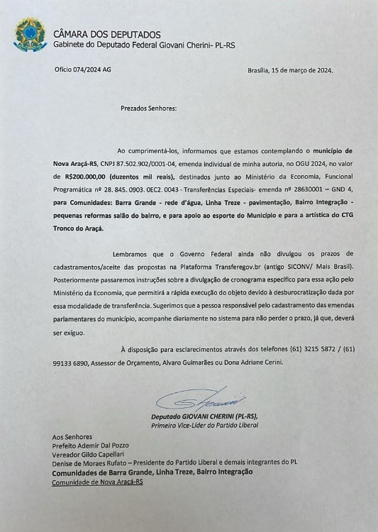 A Câmara de Vereadores de Nova Araçá agradece ao Deputado Federal Giovani Cherini pelo apoio e comprometimento demonstrados com nossa região e município.
